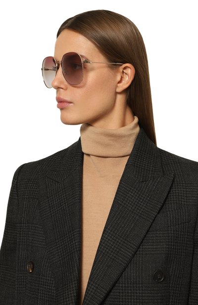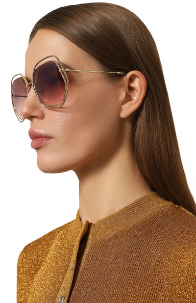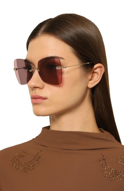 Солнцезащитные очки с узкой металлической оправой украшены ажурным узором с полупрозрачной внутренней вставкой. На петлях дужек выгравирован логотип марки. Градиентные розовые линзы категории два пропускают не более 43% видимого света.