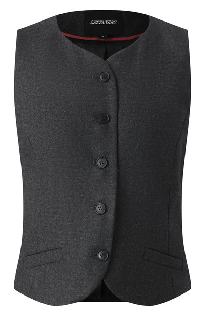 Приталенный жилет с фигурным низом и имитацией карманов спереди комфортно носить и на голое тело, и поверх водолазки. Модель из тонкой шерсти застегивается пуговицами в тон.