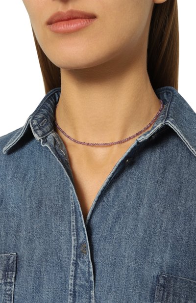 Бусы из коллекции Surfer's Babe выполнили из граненой бирюзы с характерным естественным узором. Рядом с латунным карабином, покрытым слоем родия, закрепили подвеску с фирменной литерой M.