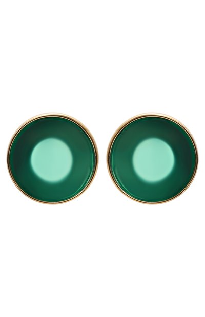 Основа серег из латуни с покрытием 14-каратным золотом почти полностью скрыта под круглой вставкой из зеленого агата. Украшение фиксируется застежками-пусетами.