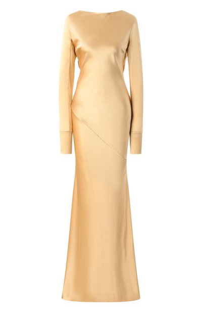 Макси-платье с глубоким вырезом и мягкими драпировками на спинке сшито из шелкового атласа. Длинные рукава дополнены широкими манжетами с обтяжными пуговицами. Модель с расклешенным подолом застегивается потайной молнией сбоку.