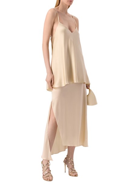 Топ со структурированными чашечками и узкими бретелями дополнили широкой баской и хлопковым подкладом. Модель из атласа с добавлением шелка застегивается потайной молнией сбоку.