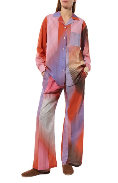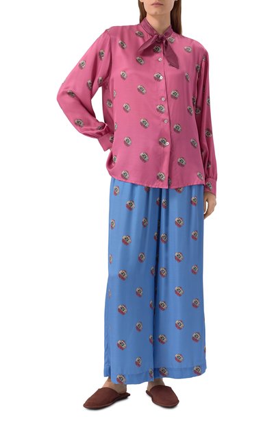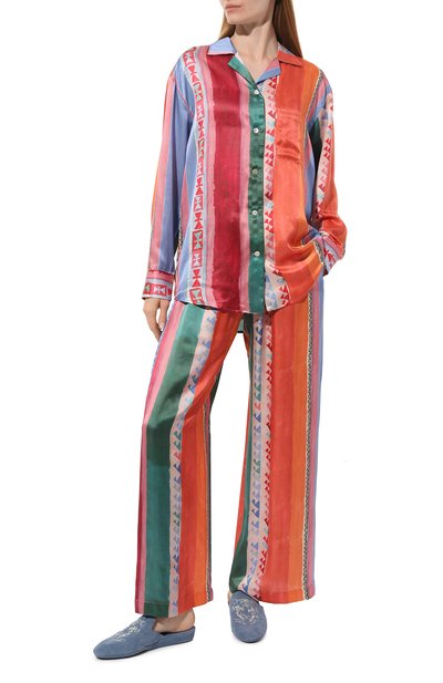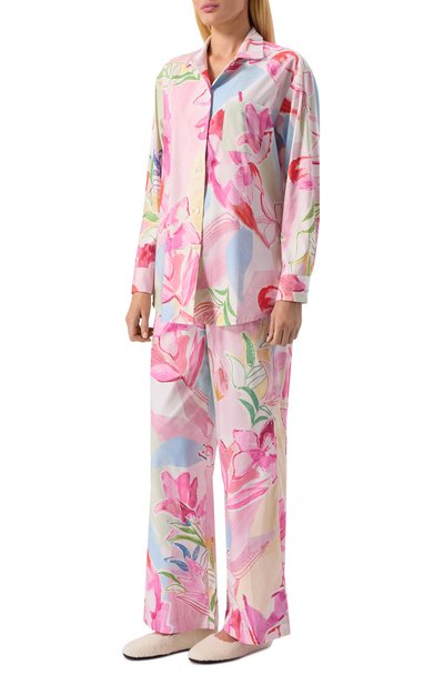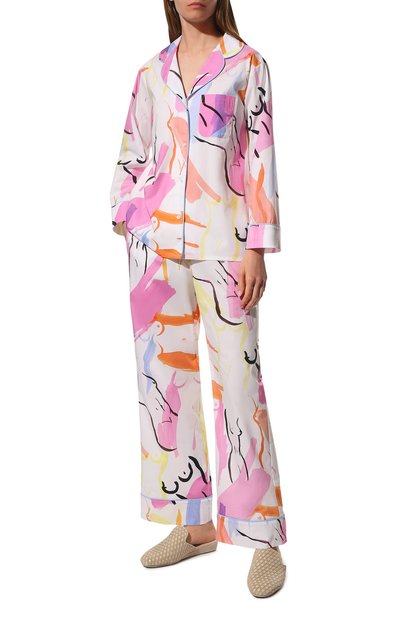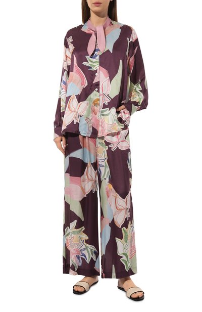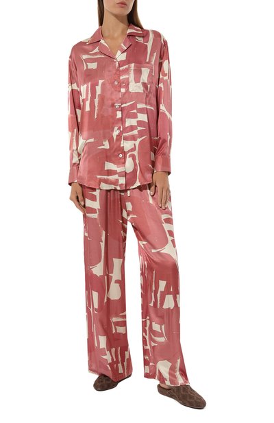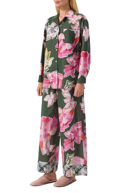 Для пошива пижамы Bowie Lily Green с цветочным узором использовали хлопок с добавлением шелка. Свободную рубашку дополнили воротником аскот, а у шортов с двумя боковыми карманами предусмотрели широкий эластичный пояс-кулиску.