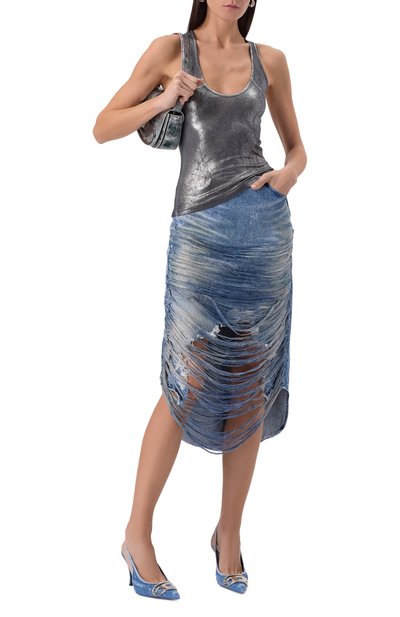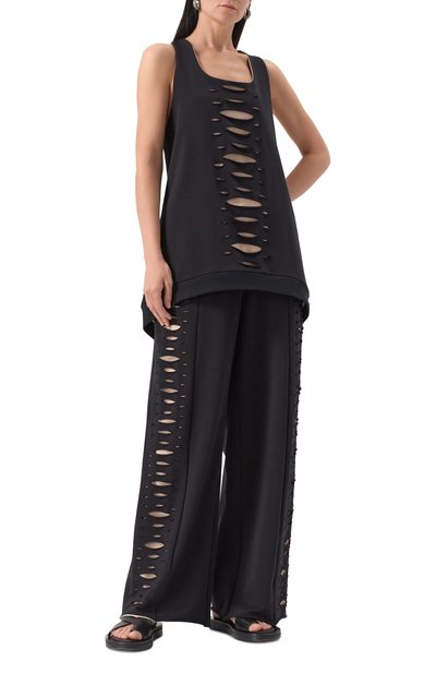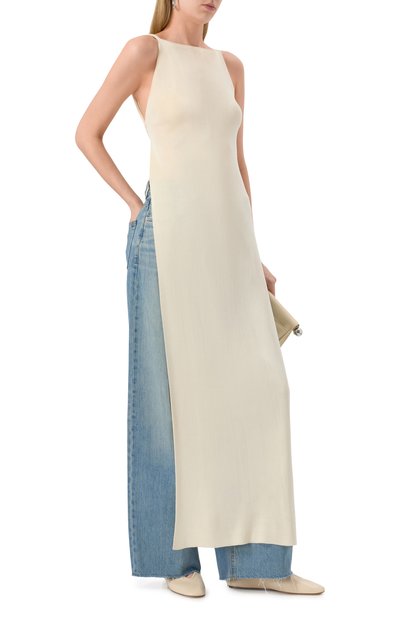 В коллекцию The skin I love in вошел свободный топ «Уроборос» с глубокими проймами и перекрученной Т-образной перемычкой. Модель с удлиненной спинкой украсили прорезями на лицевой и принтом на изнаночной сторонах.