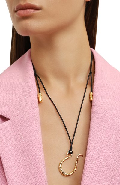 Колье-цепочку «Феникс» с каплевидными подвесками на концах дополнили эмалевыми деталями в виде птиц, разместив между ними круглую вставку, инкрустированную чароитом. Аксессуар из латуни с гальваническим покрытием золотом регулируется слайдером.