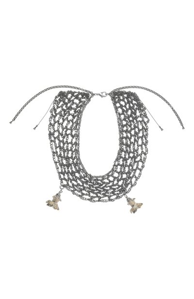 Широкое колье из цепочек дополнили двумя подвесками-рыбами с хрустальными глазами. Для изготовления аксессуара с карабином использовали латунь с гальваническим покрытием оксидом серебра.
