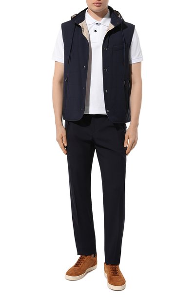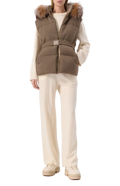 Стеганый пуховый жилет с шевронным жаккардов ым узором сшили из шерсти с водоотталкивающей пропиткой. Модель с нейлоновым подкладом дополнили боковыми и внутренним карманами, отстегивающимся капюшоном со съемной отделкой из меха чернобурки и ремнем с брендированной пряжкой-фастексом.