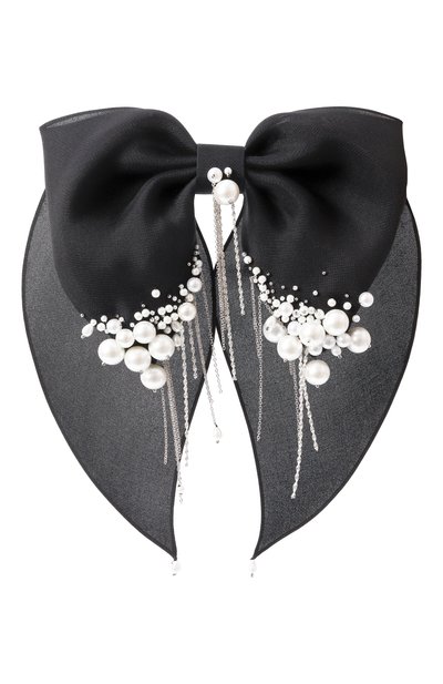 Объемный шелковый бант с металлической заколкой-автоматом расшили перламутровыми бусинами и бисером, дополнив декор цепочками. Края подчеркнули каплевидными подвесками.