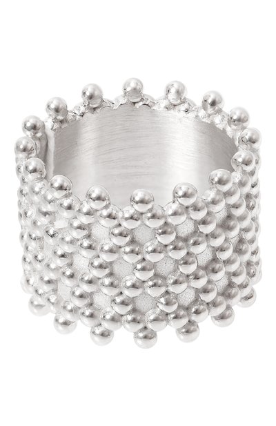 Кольцо, вдохновленное фенечками из 2000-х, украсили рельефным узором, имитирующим плетение из бисера. Модель из коллекции «Пайетки» выполнили из серебра 925-й пробы с родиевым покрытием.