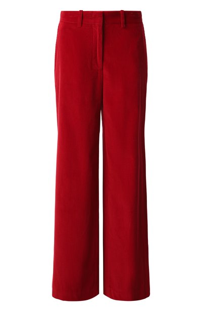 Широкие брюки с высокой посадкой сшили из хлопкового вельвета. Модель со шлевками для ремня на поясе дополнили боковыми карманами.