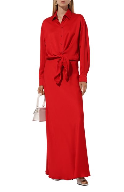 Свободную рубашку с нагрудным карманом, украшенным брендированной пластиной, сшили из хлопковой ткани с жатым эффектом. Модель дополнили длинными отрезами по бокам, которые можно завязать спереди.