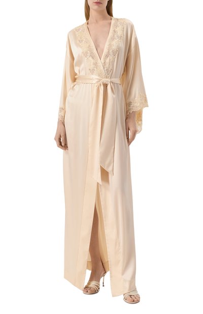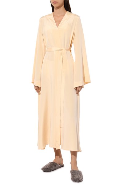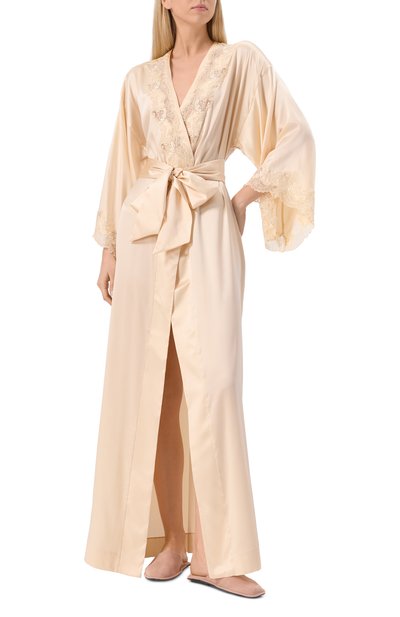 Короткий халат с чуть спущенной линией плеч сшили из эластичного шелкового атласа. Модель дополнили поясом-лентой из такого же материала, который играет роль застежки и подчеркивает талию.