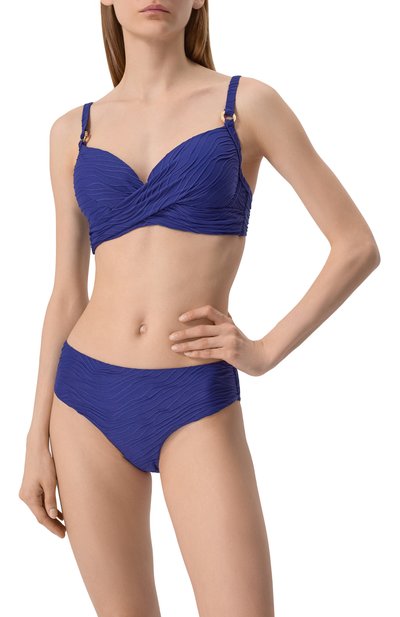 Бра-топ с драпированными чашечками на косточках сшили из микрофибры. Модель со съемными регулируемыми бретелями застегивается плоским брендированным замком на поясе сзади.