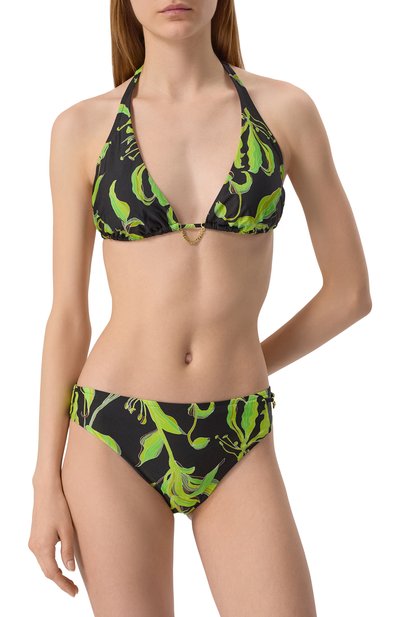 Бра с тропическим мотивом выполнили из микрофибры стрейч на основе нейлона и полиэстера. Треугольные чашечки изделия дополнили съемными вкладышами. Посадку модели из коллекции Paradis Sauvage можно регулировать бретелями, две из которых украсили вставками-кольцами.