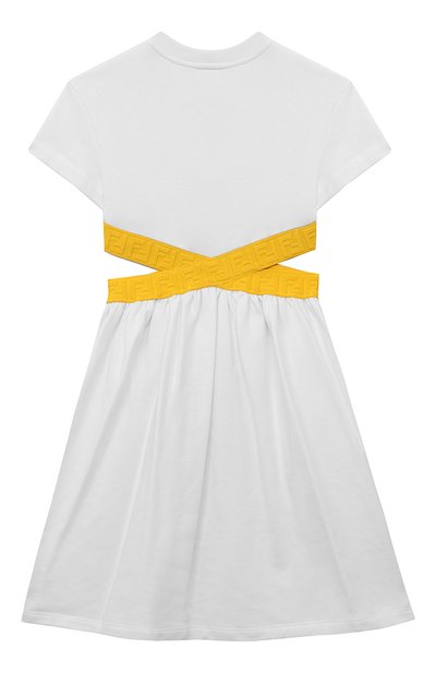 Платье с асимметричным пышным подолом выполнили из хлопкового джерси. Спереди модель украсили фирменной графичной монограммой, вышитой золотистыми нитями.