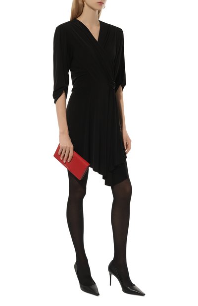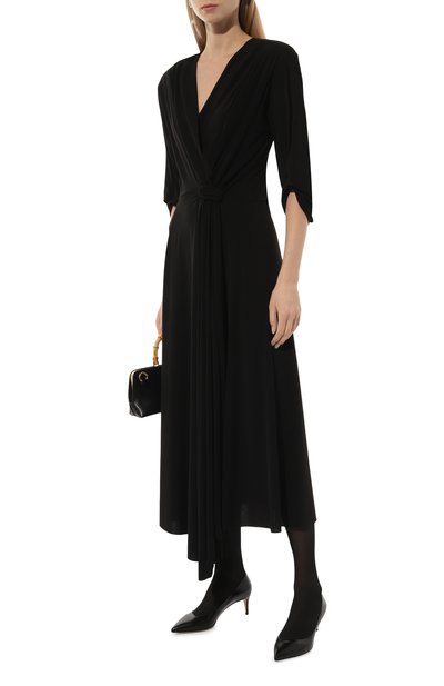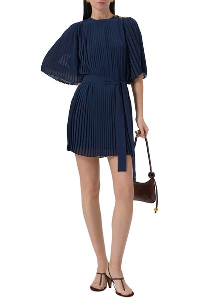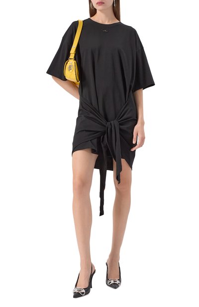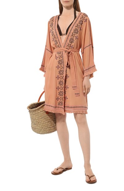 Тунику-кимоно сшили из полупрозрачного вторичного полиэстера с принтом в виде тропических листьев. Из такого же материала выполнили пояс-ленту, который фиксирует модель на талии.