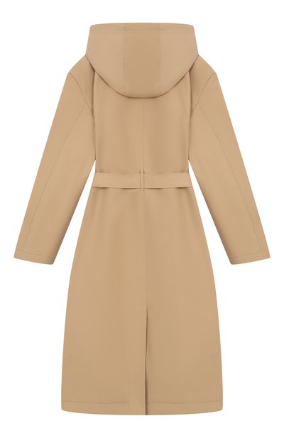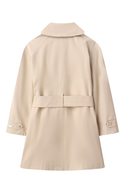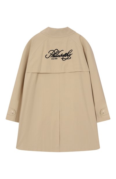 Двубортный тренч с погонами, поясом и боковыми карманами с клапанами сшили из нейлона с жатой фактурой. Отлетную кокетку на спинке украсили нашивкой с логотипом бренда.