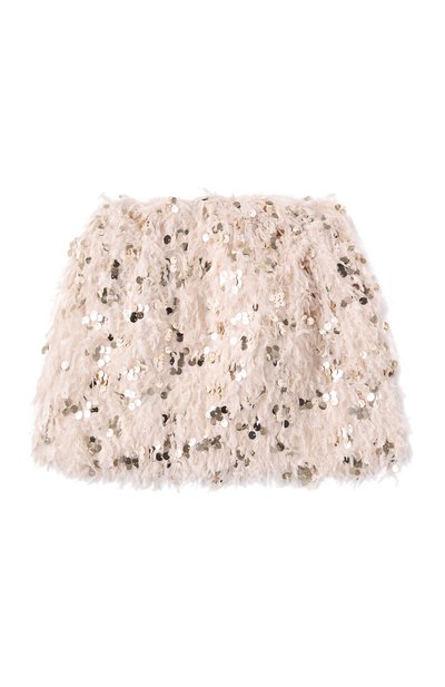 Короткую юбку с хлопковым подкладом выполнили из легкого полиэстера с бахромой, имитирующей перья. Модель, украшенную брендированной нашивкой сзади, расшили крупными золотистыми пайетками.