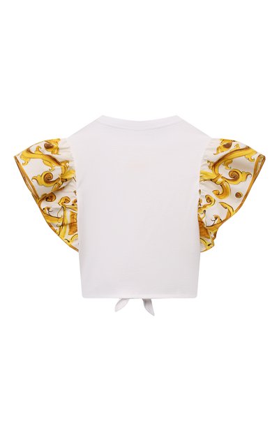 Футболку с вышитым логотипом в тон и пуговицей сзади сшили из органического хлопкового интерлока. Многоярусные оборки на плечевом окате выполнили из вуали с вышивкой Broderie anglaise и отделкой jour échelle.