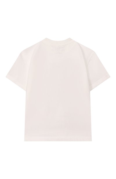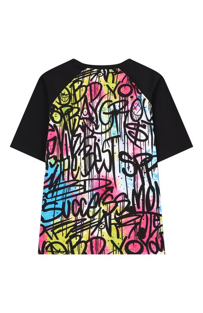 Футболку с принтом в стиле stickerbomb сшили из органического хлопка. Кант, укрепляющий круглую горловину, оставили однотонным.