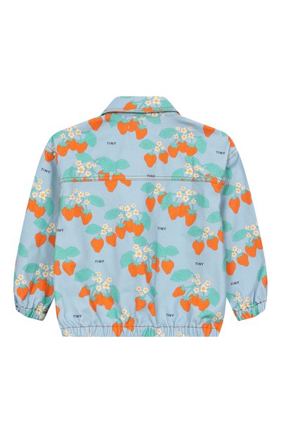 Джинсовую куртку с отложным воротником, эластичными поясом и манжетами сшили из мягкого денима. Кокетку спереди и сзади украсили цветочной вышивкой крестиком.