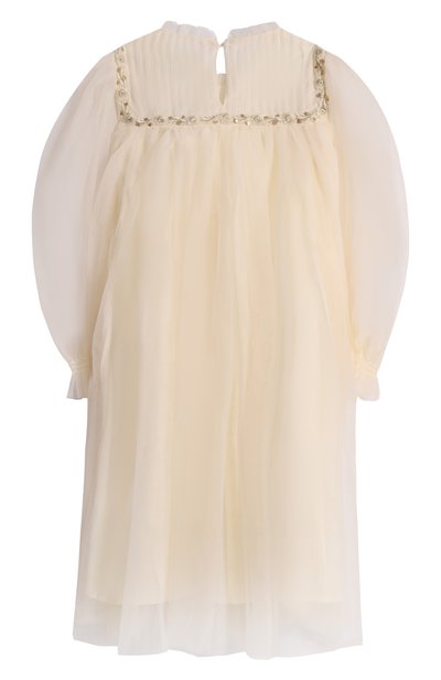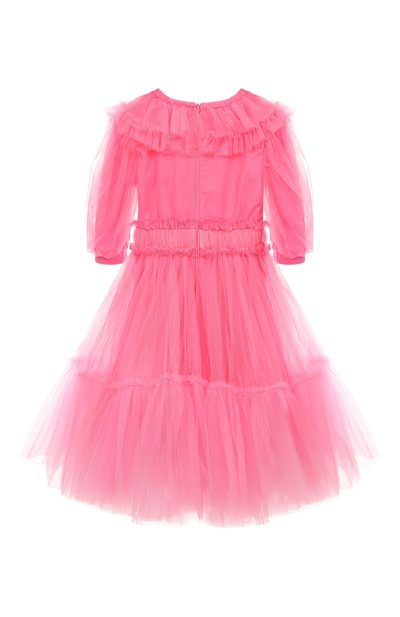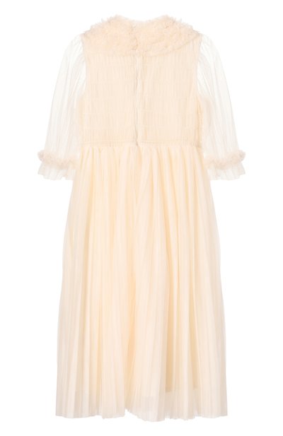 Платье Victoria с оборками на лифе и плиссированным подолом выполнили из тюля. Модель с потайной молнией на спинке дополнили хлопковым подкладом так, чтобы рукава 3/4 остались полупрозрачными.
