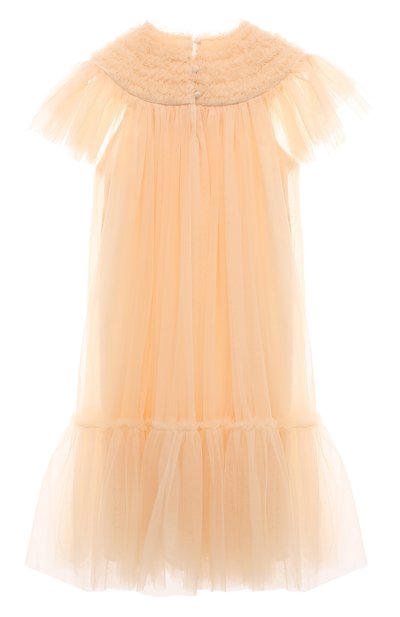 Платье Frida с широким воланом на расклешенном подоле сшили из сетчатого тюля и дополнили хлопковым подкладом. Модель с пуговицами на спинке украсили узкими оборками на коротких рукавах, а талию подчеркнули атласным поясом-лентой.