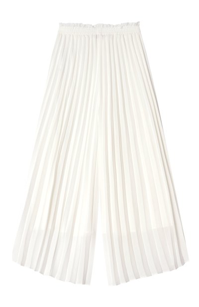 Широкие брюки с двумя боковыми карманами и накладкой-сердцем со стразами сшили из матового атласа. Модель со шлевками и эластичной вставкой на талии дополнили съемным поясом-лентой.