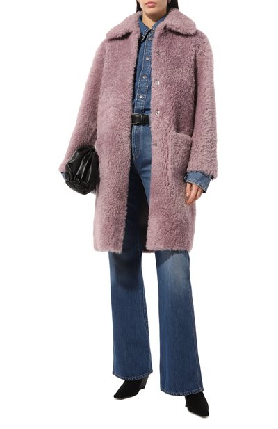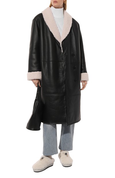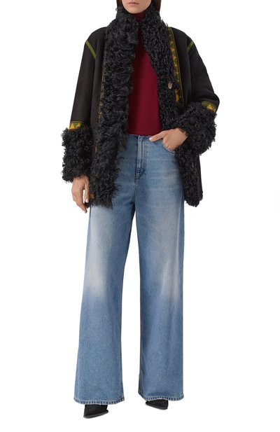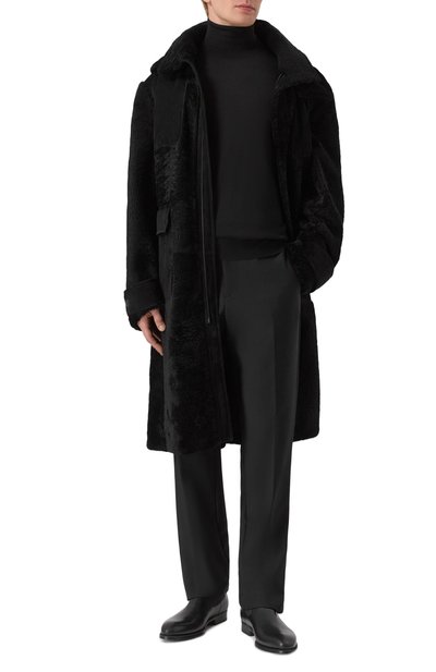 Для пошива дубленки с боковыми карманами использовали овчину с крупнозернистой внешней стороной. Воротник, манжеты, планку застежки и низ модели подчеркнули меховой отделкой.