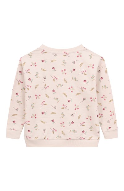 Свитшо т сшили из трикотажного микса полиэстера и хлопка с флисовой изнанкой. Модель с рифлеными манжетами, низом и горловиной украсили разноцветным слоганом, дополненным изображением игрушек, звезд и сердец.