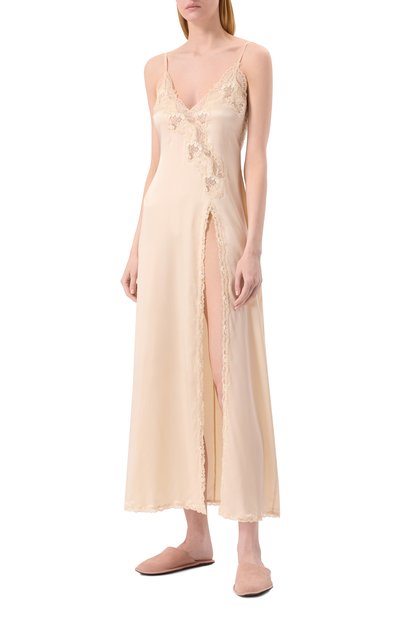 Сорочку с глубоким вырезом, полуоткрытой спиной и отрезным подолом сшили из шелкового атласа с добавлением эластана. Двойные бретели регулируются слайдерами.