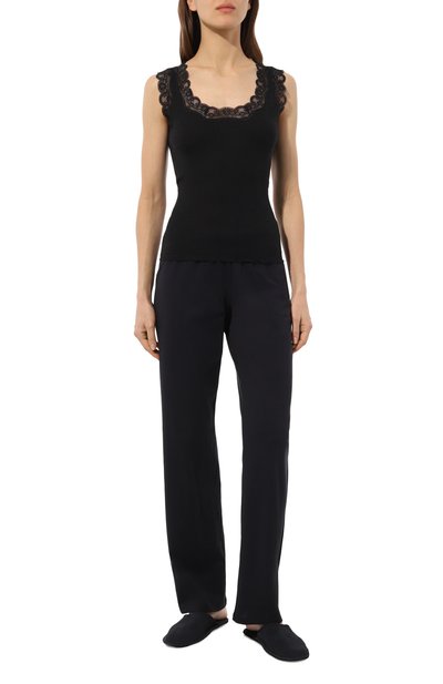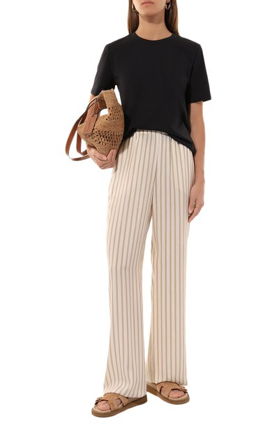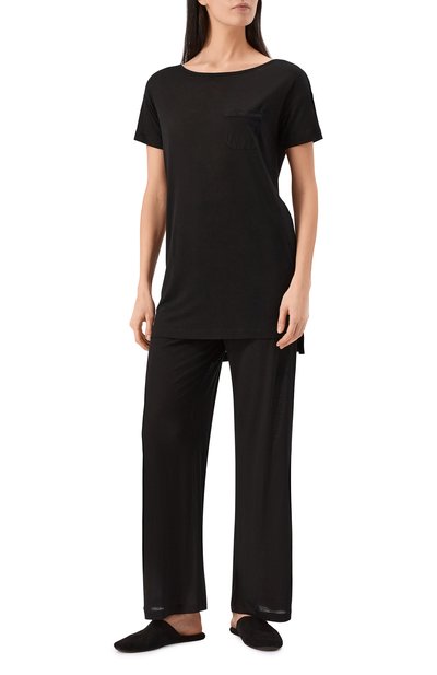 Футболку с удлиненной спинкой и боковыми разрезами сшили из трикотажа на основе тенсела. Модель со спущенной линией плеч дополнили нагрудным накладным карманом.