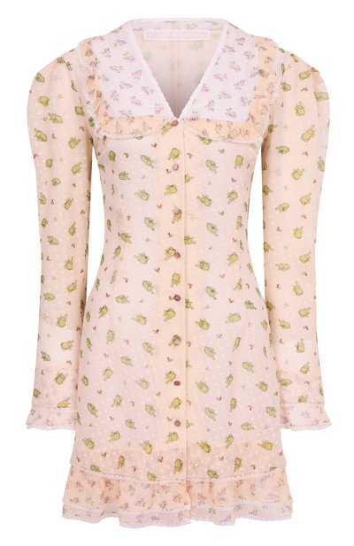 Мини-платье из филькупе украсили на расклешенных манжетах и по краю подола оборками из жатого шифона вдоль манишки. Модель с авторским принтом застегивается пуговицами с монограммой УС спереди.