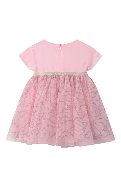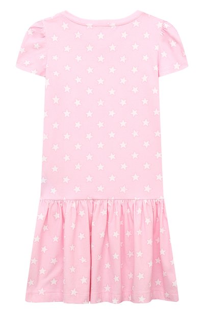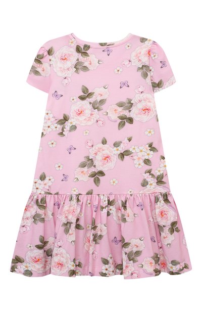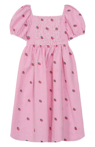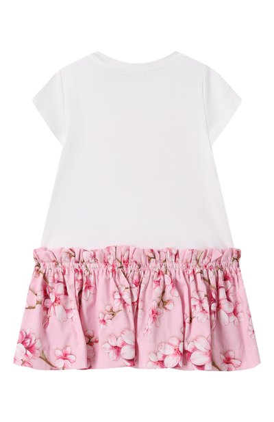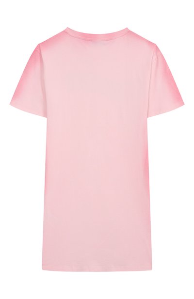 Платье, напоминающее комплект из юбки и футболки, сшили из хлопкового джерси. Спереди модель с парными защипами на плечах украсили разноцветным брендированным принтом Fruits Stickers.