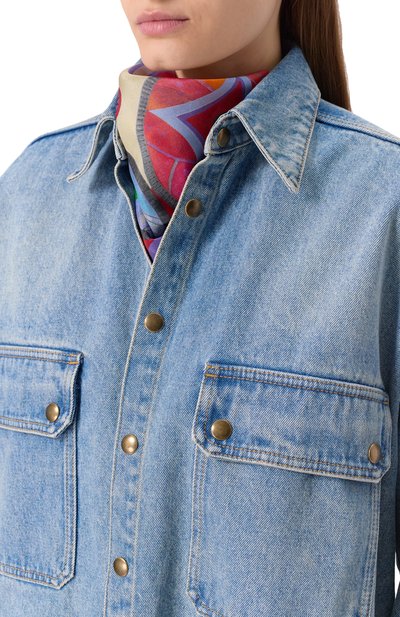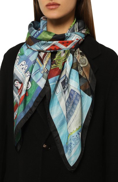 Шаль «Крещенская ярмарка» с короткой бахромой по краям выполнили из модала с добавлением кашемира. Аксессуар дополнили фольклорным авторским принтом, созданным художницей Соней Уткиной.