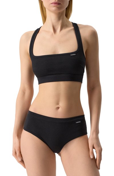 Бра из линии Cotton Comfort сшили из эластичного хлопка в рубчик. Сзади между Т-образной перемычкой и широким поясом расположили разрез. Одну из мягких чашечек спереди украсили брендированным ярлыком.