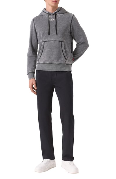 Зауженные чиносы Nik с застежкой на брендированную пуговицу и молнию сшили из слегка потертого эластичного хлопка. Помимо карманов по бокам, предусмотрели два прорезных сзади, украсив правый патчем с литерой B. На поясе — шлевки для ремня.