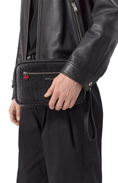 Борсетку с брендированным цупферным замком выполнили из кожи крокодила, отшлифованной до неяркого блеска. Аксессуар со съемной ручкой-петлей декорировали фирменной треугольной эмблемой на задней панели. Внутри предусмотрели два кармана: открытый и на молнии.