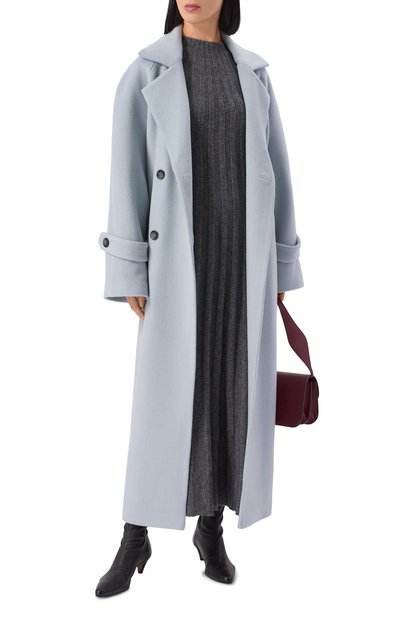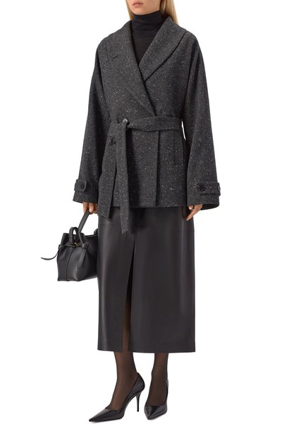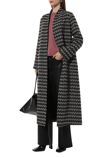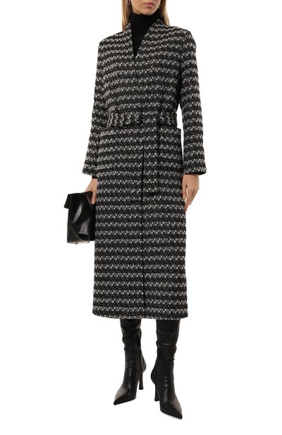 Пальто с жаккардовым геометрическим узором сшили из шерсти с добавлением металлизированных нитей. Модель на вискозном подкладе, с прямоугольными лацканами и спущенной линией плеч застегивается потайными кнопками.