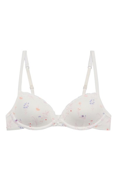 Бюстгальтер с цветочным мотивом выполнили из смесового материала на основе модала и хлопка. Спереди модель украсили кружевом и атласным бантом. Посадку можно регулировать бретелями со слайдерами и поясом с двумя крючками и тремя вариантами объема.