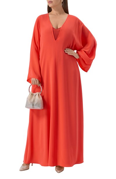 Приталенное платье с овальным вырезом на спинке выполнили из шелка. На подоле модели сформировали плавные складки, а плечи подчеркнули защипами.