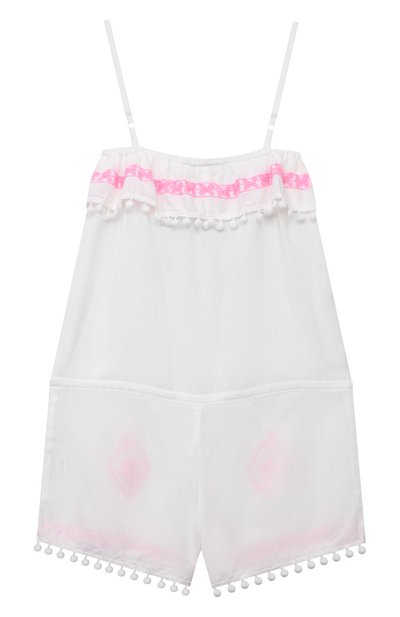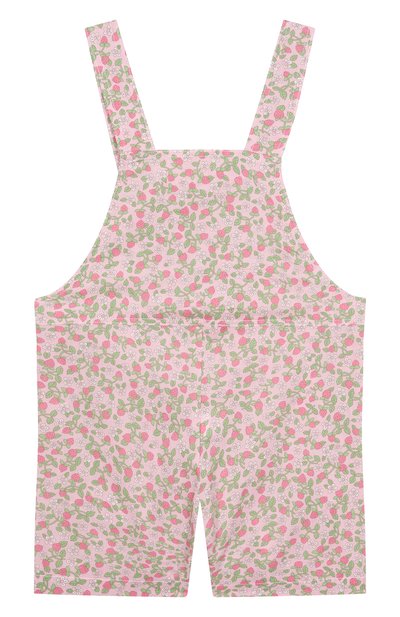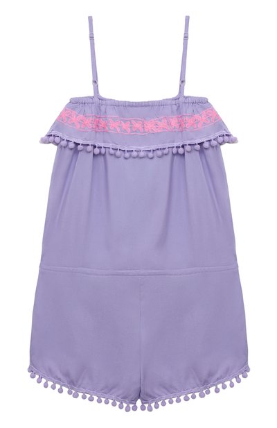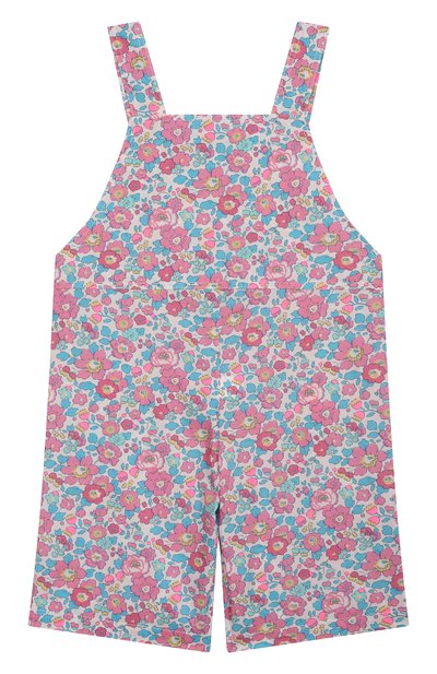 Джинсовый комбинезон с широкими бретелями, отворотами и переливающимися кнопками дополнили эластичными вставками на проймах и линии талии. Модель из чистого хлопка украсили разноцветной вышивкой. В комплекте — ремень.