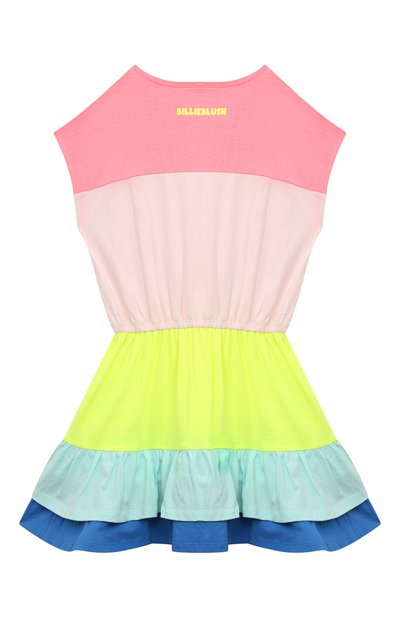 Ажурное платье связали из акриловой пряжи, сформировав разноцветный полосатый узор. Круглую горловину дополнили кантом в рубчик, а проймы и низ подчеркнули фестонами. Сбоку закрепили фирменный ярлык.