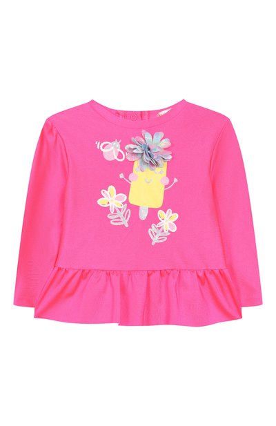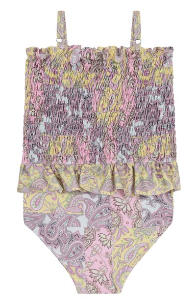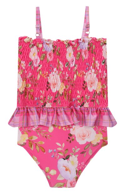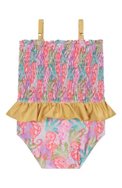 Слитный купальник с оборками на бретелях сшили из стрейчевой микрофибры. Спереди модель украсили разноцветным брендированным принтом, подчеркнутым глиттером.