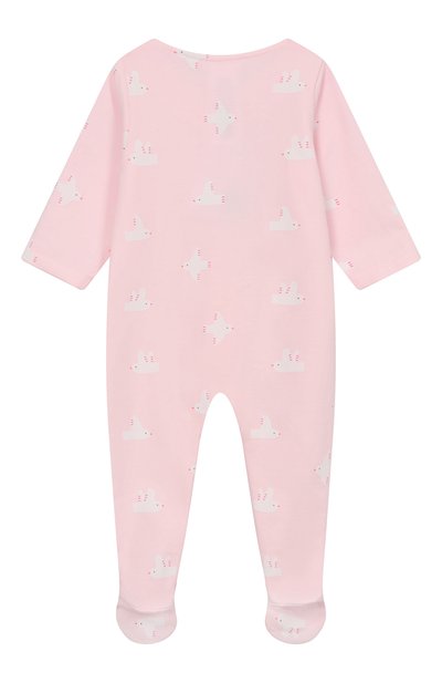 Комбинезон с кнопками по всей длине спереди и закрытыми стопами сшили из хлопкового трикотажа. Из такого же материала выполнили нагрудник с фестончатой оборкой по краям и крупной надписью в центре.