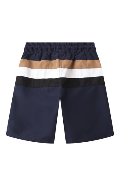 Плавки-шорты с карманами по бокам сшили из полиэстера. Эластичный пояс в цветах фирменного триколора украсили брендированным ярлыком, которому вторит принт на левой брючине. Спереди предусмотрели шнуровку.