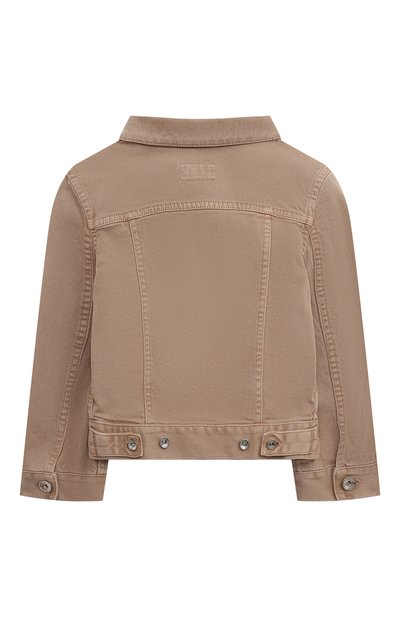 Куртку выполнили из хлопкового денима с жаккардовым паттерном из логотипа марки. Модель дополнили парой боковых прорезных карманов и двумя нагрудными накладными. Пояс сзади украсили брендированным патчем.