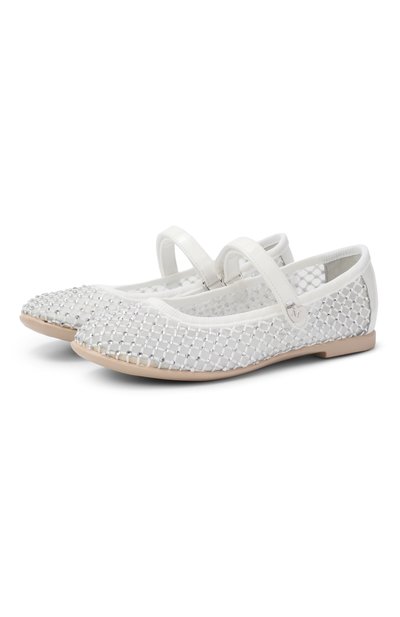 Балетки с круглым мысом сшили из лакированной кожи и текстильной сетки со стразами. Модель на тонкой нескользящей подошве дополнили ремешком велкро с фирменной подвеской-сердцем из серебристого металла.