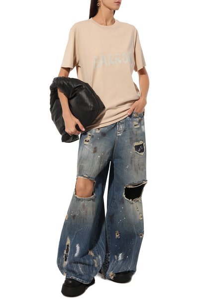 Oversize-футболку из коллекции Voyage by Chapurin сшили из хлопкового джерси с добавлением лайкры. Модель со спущенной линией плеч декорировали названием капсулы спереди и фотопринтом с корсиканским пейзажем на спинке.