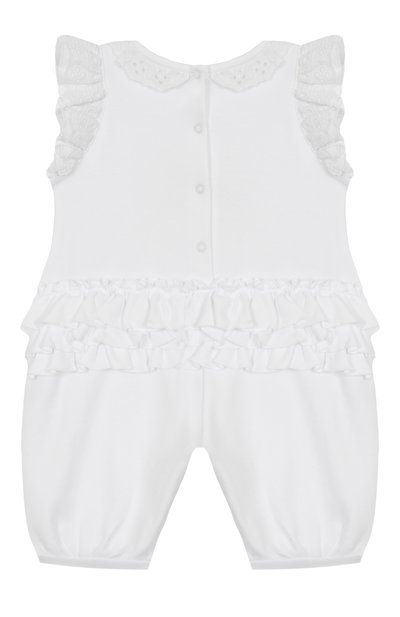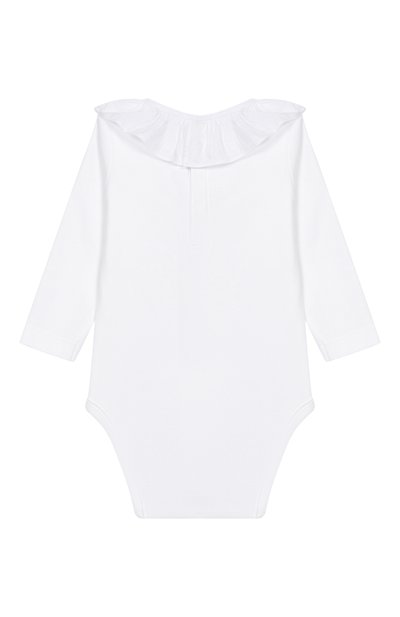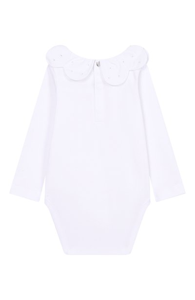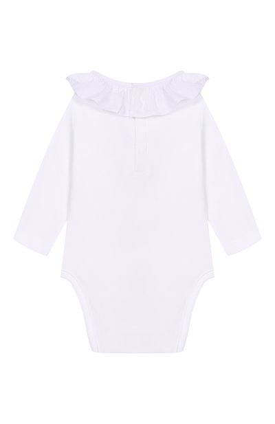 Боди из джерси на основе органического хлопка украсили принтом в виде кроликов и надписью Tiny under the midnight sun. Модель с круглой горловиной застегивается кнопками на спинке и внизу.
